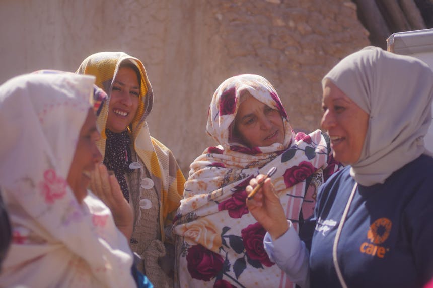 Bewoners van het dorp Makhfamane praten met een CARE-medewerker. Foto: CARE Maroc