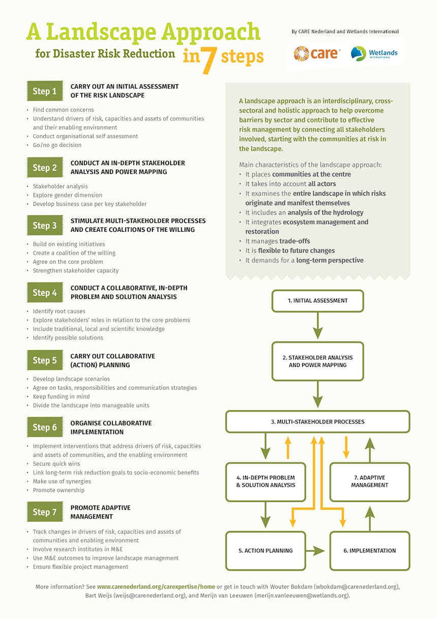 Based on the experience of CARE and Wetlands International in the Partners for Resilience alliance, and on best practices developed by other experts, this paper synthesises the main characteristics of the landscape approach and suggests seven steps when adopting a landscape approach. Although this paper focuses specifically on disaster risk reduction to help increase community resilience, the landscape approach is applicable to other types of programming.