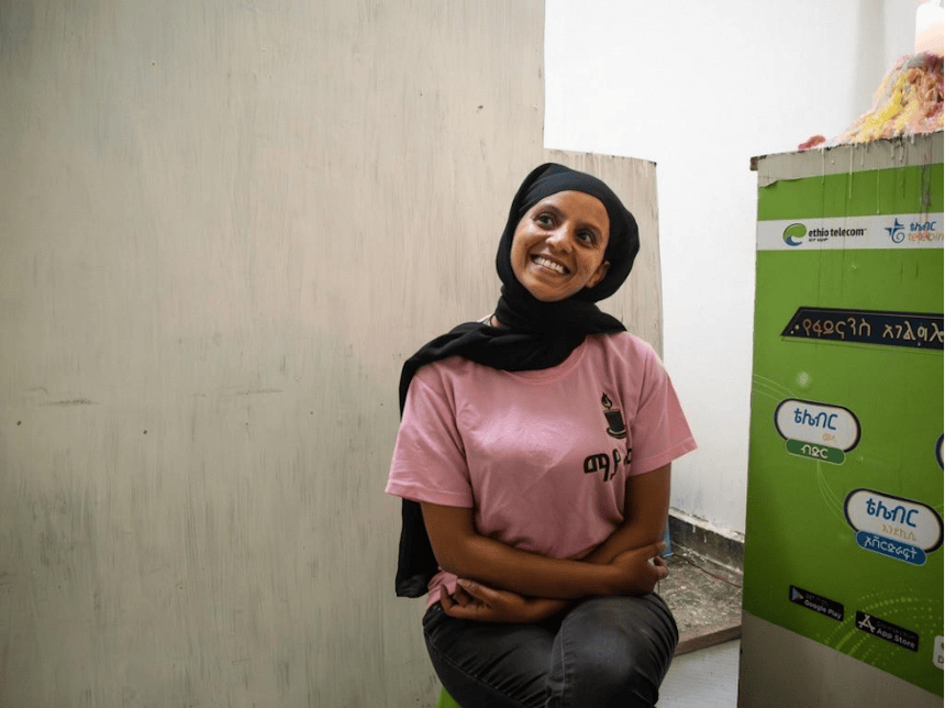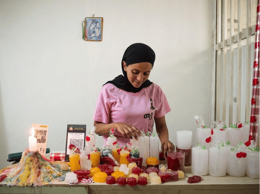Aan een drukke snelweg die als een slagader door Addis Ababa loopt, ligt een winkelcentrum met verschillende winkels en werkplaatsen. Hier ontmoeten wij de innemende Birtukan (31). Haar bedrijf Maya Candles – vernoemd naar het Amhaarse woord voor ‘iets dat licht doorlaat’ – voorziet zowel individuele klanten als kerken en uitvaartcentra van handgemaakte kaarsen. In dit atelier maakt ze niet alleen de producten, maar verwelkomt ze ook haar klanten.