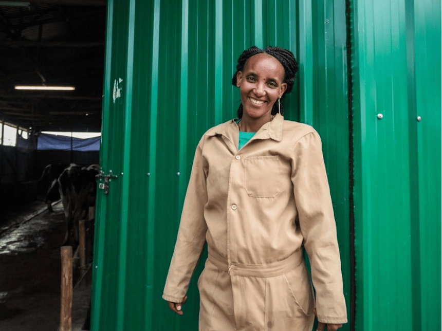 Omringd door het geluid van loeiende koeien werkt Ajebush (30) onvermoeibaar in haar grote, groene stal. Na haar studie had ze de kans om voor een bank te werken, iets wat veel afgestudeerde Ethiopiërs willen. Toch koos ze bewust voor een toekomst in de landbouw.