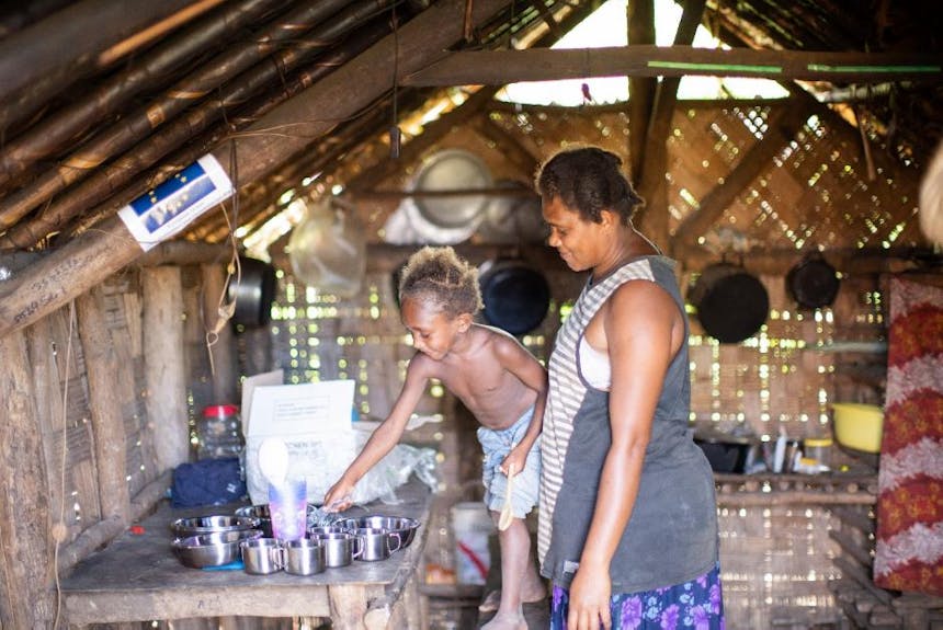 Het oog van de storm trok op 6 april direct over het eiland Pentecost. Shelly’s kleine keukenhuis, in het dorp Hotwota, stond toen nog overeind. Samen met een groepje buurtgenoten zocht ze er dekking. Al snel sloeg een rondvliegend stuk dakbedekking dwars door een van de muren en stroomde de regen naar binnen. “We waren bang dat er een muur zou instorten”, legt Shelley uit. “Daarom hebben we onze kinderen onder het bed laten schuilen.” De overblijfselen van Shelley’s huis geven een akelig beeld weer van de angstige momenten die ze hebben moeten doorstaan.