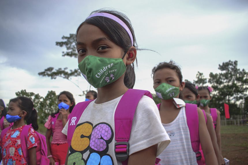 Een schoolmeisje glimlacht terwijl ze in de rij staat met haar klasgenoten. Schoolspullen worden uitgedeeld in Agusan del Sur door ACCESS. Na bijna twee jaar verstoord onderwijs door de pandemie waren de leerlingen enthousiast om terug naar school te gaan en weer samen te zijn met hun vrienden.
