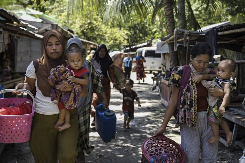 Vrouwen lopen met hun kinderen en hun meest belangrijke eigendommen door een dorp in Datu Saudi Ampatuan tijdens een simulatie oefening. Deze oefening is bedoeld om de vrouwen voor te bereiden voor het eventueel uitbreken van conflict in het dorp en de daaropvolgende evacuatie.